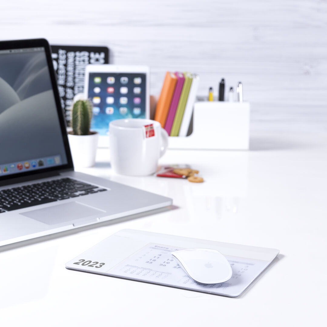 Alfombrilla calendario de suave acabado en PVC. Diseño mes en curso/mes anterior/mes siguiente, con espacio para anotaciones. Base acolchada antideslizante y disponible en variada gama de colores.
