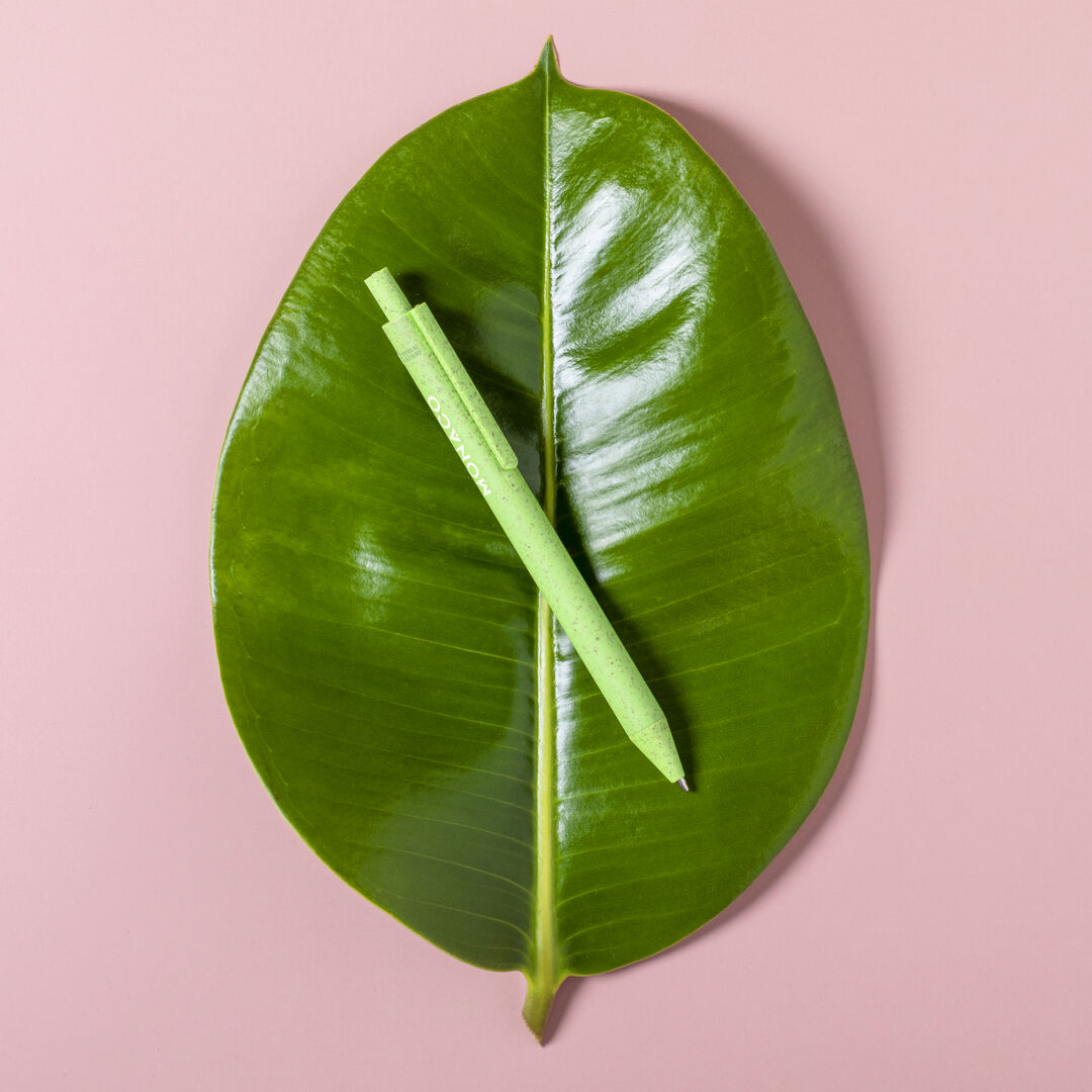 Bolígrafo de línea nature con mecanismo pulsador. Cuerpo en caña de trigo y PP, para así fomentar la utilización de materias primas naturales y reducir las emisiones contaminantes. Clip con amplia superficie de marcaje y disponible en variada gama de colores pastel, con tinta azul. Con distintivo Wheat Straw en la parte superior del bolígrafo.