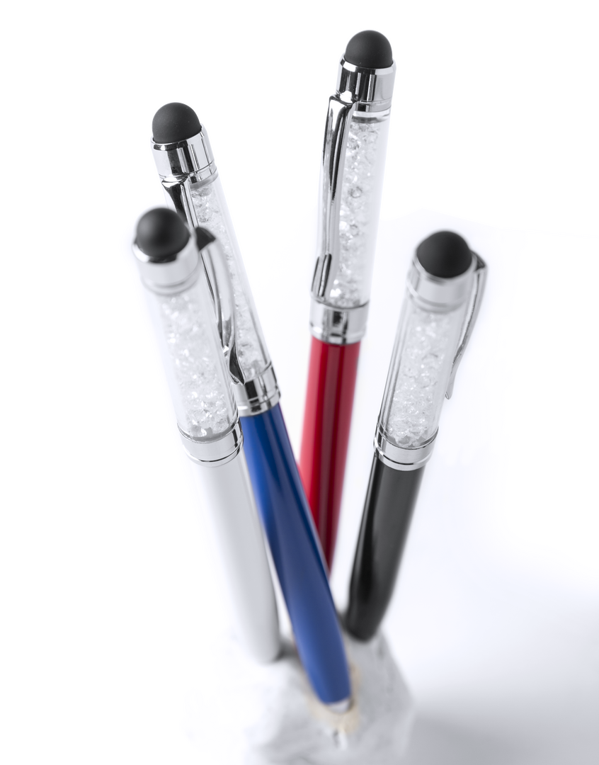 Original bolígrafo puntero de mecanismo giratorio con divertido líquido burbujeante en parte superior. Cuerpo metálico en suave acabado de vivos colores y accesorios en color plateado brillante. En tinta azul.