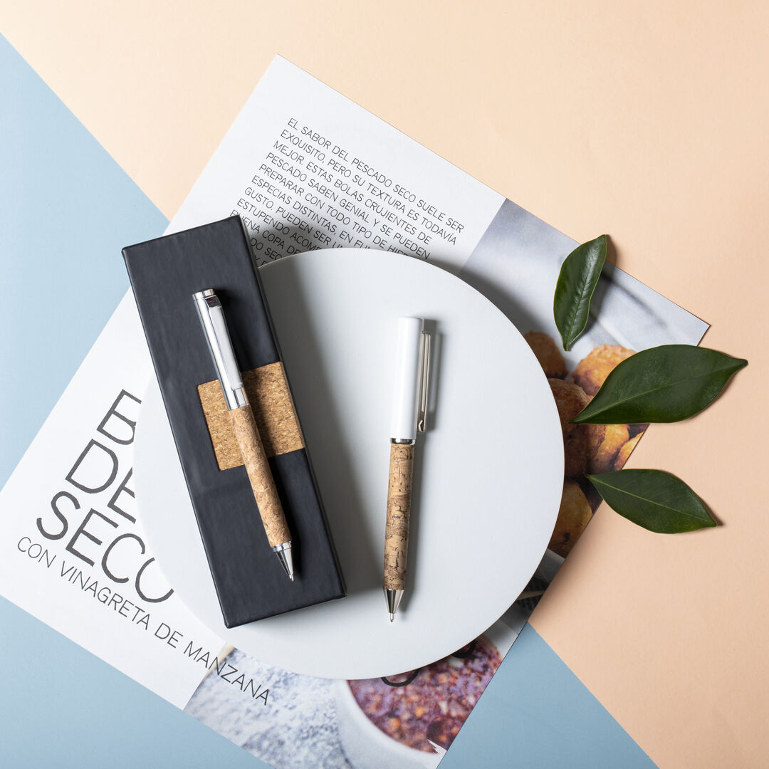 Bolígrafo de línea nature en combinación de corcho natural y metal. Con original clip metálico de acabado cromado, a juego con la punta y la anilla. Parte superior en color blanco, de mecanismo giratorio y con tinta azul. Presentado en caja individual de diseño eco.