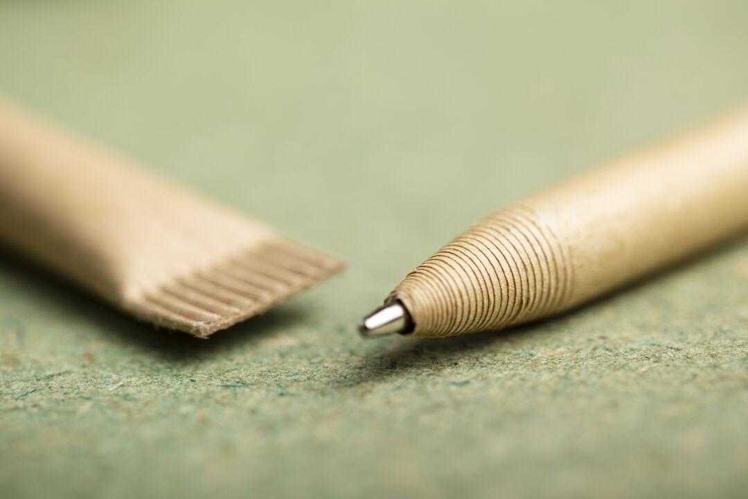 Bolígrafo de línea nature en cartón reciclado y original capucha a juego. Con tinta azul y disponible en variada gama de colores nature.