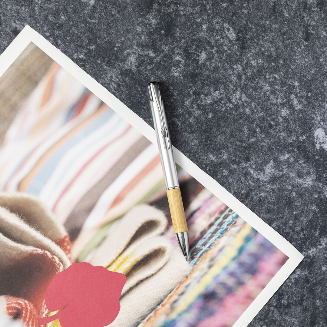 Elegante bolígrafo de línea nature y mecanismo pulsador. Cuerpo en resistente ABS de acabado brillo y empuñadura en bambú, con accesorios a juego. Clip metálico, con cartucho jumbo y en tinta azul.