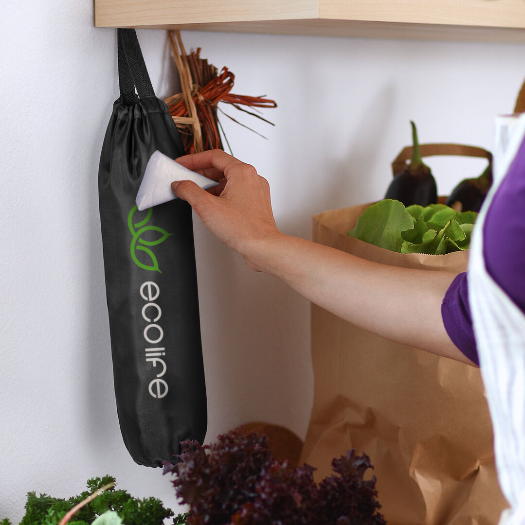 Bolsa de reciclaje para guardar bolsas de plástico. En suave poliéster 210D de alegres colores y con apertura superior e inferior. Con cinta a juego para colgar.