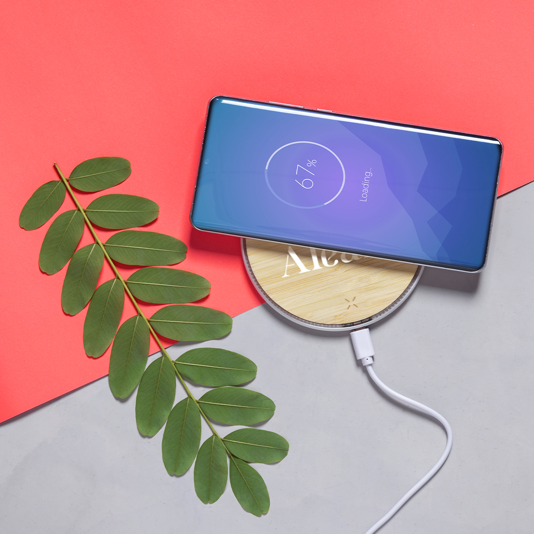 Cargador inalámbrico de línea nature, con base de carga en madera de bambú. Base antideslizante y compatible con dispositivos equipados con tecnología de carga inalámbrica. Presentado en atractiva caja de diseño. Cable USB incluido.