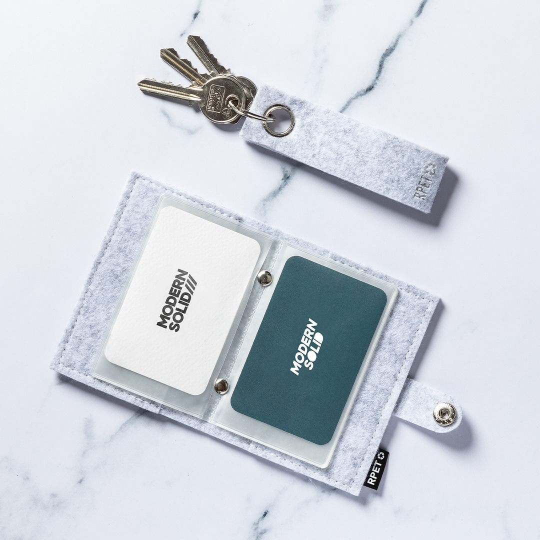 Elegante llavero con cinta fabricada en fieltro RPET y ojal metálico cromado. Con distintivo fieltro RPET en la cinta y anilla metálica cromada. El fieltro RPET es fruto de la combinación del proceso de reciclaje de materiales plásticos junto con la técnica milenaria de fabricación del fieltro, dando como resultado un material de eco-tendencia que, además de ser de origen reciclado, también se convierte en reciclable.