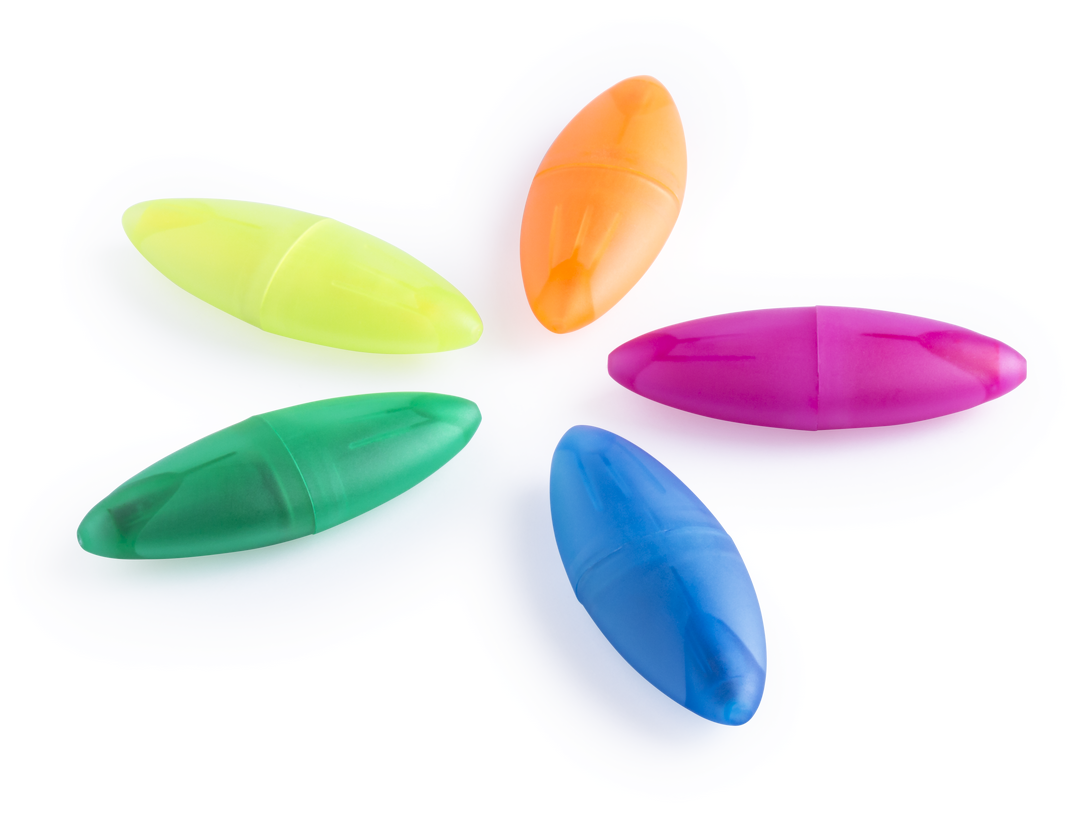 Marcador fluorescente diseño minimalista en divertidos colores, con cuerpo y capucha en acabado translúcido.