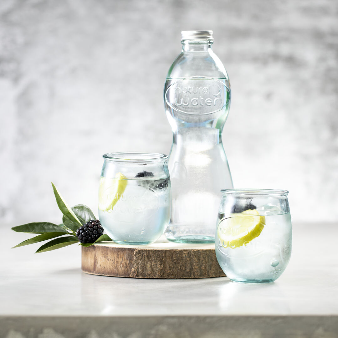 Set de de línea nature de 2 vasos de 400 ml y una botella de 1l. De fabricación europea y hechos en vidrio reciclado GRS. Botella con tapón a rosca metálico. Set presentado en estuche de cartón reciclado con ventana. La certificación GRS (Global Recycled Standard / Estándar de Reciclaje Global), garantiza el origen reciclado del material usado para fabricar el producto.