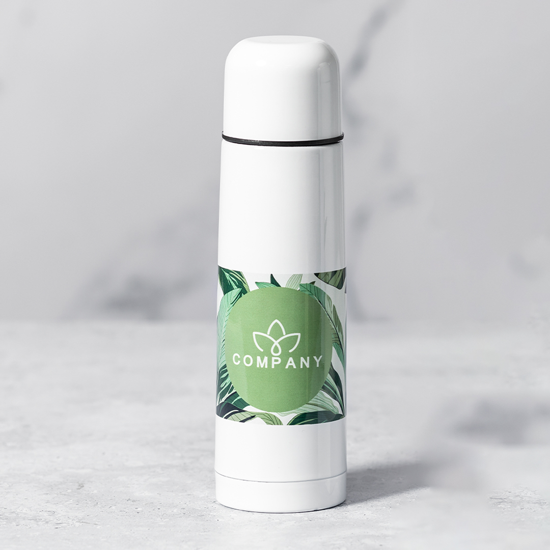 Termo de 500ml de capacidad en resistente acero inox. Superficie exterior especialmente diseñada para marcaje en sublimación. Con tapón de seguridad y presentado en atractiva caja individual de diseño.